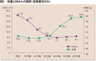 食事療法のみでHbA1cは12.3%から8.7%(2か月後)、6.4%(3か月後)5.7%(4か月後)に改善、体重は大きくは変わらず(図3)。
