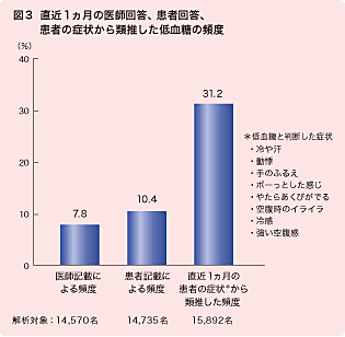 直近1ヵ月の低血糖発現率は、主治医の判断では7.8%であったのに対し、患者自身の申告では10.4%と、患者申告のほうが2.6%高いことが明らかになりました(図3)。これは患者が低血糖を起こしていても主治医が認識できていない可能性があることを意味しています。主治医はもう少し緻密に問診を行わなくてはなりません。さらに、自覚症状チェックシートの結果では、低血糖で生じることの多い「冷や汗」、「動悸」、「手のふるえ」、「ボーっとした感じ」、「やたらあくびがでる」、「空腹時のイライラ」、「冷感」、「強い空腹感」にチェックをいれていた患者の割合は31.2%と、主治医と患者が低血糖と回答した割合を大きく上回っていました。これはすなわち、患者本人も主治医も気づかない“隠れ低血糖”の存在を示唆すると考えられます。