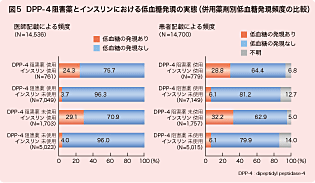 また、確かにDPP-4阻害薬単剤使用における低血糖の発現は少ないのですが、インスリンを併用するとやはり増えてきます。しかし、興味深いことに、DPP-4阻害薬とインスリンの使用・未使用の組み合わせで検討してみると、DPP-4阻害薬未使用・インスリン使用の場合に比べて、両者を併用したときのほうが低血糖の発現が少ないことがわかりました(図5)。SU薬とDPP-4阻害薬の組み合わせでも同様の結果が得られています。これはおそらく、DPP-4阻害薬を併用する場合には、インスリンあるいはSU薬の用量が低く抑えられているためではないかと思います。また、日常臨床においては、DPP-4阻害薬を上乗せすることによって血糖の日内変動の振れ幅が小さくなることも経験しますので、それも理由の1つかもしれません。