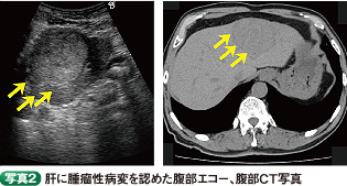 。また、腹部エコー・CTでは、肝左葉外側域に63×53×49mmの内部均一な腫瘤性病変が認められ、組織学的に肝細胞癌と診断された