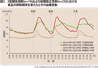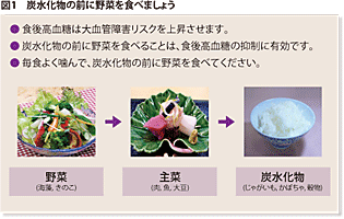 糖尿病発症早期からの生活習慣介入が合併症の予防に重要である。当院では毎食野菜から食べる「食べる順番療法」を早期に実践してもらう。科学的根拠を示すことにより食事療法の継続率は98%と非常に高い。