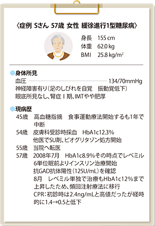 2型糖尿病の発症様式を示した症例の中に、緩徐進行1型糖尿病症例が一定の割合で存在する。私たちの検討では2型として治療されていた症例のうち3.6%が抗GAD抗体陽性であった*。2型糖尿病として治療を受けていた患者が、緩徐1型糖尿病と診断された場合、とりわけインスリン療法の受け入れにしばしば困難さを生じる。今回は当院にて経験した症例をもとに、緩徐進行1型糖尿病患者のインスリン導入時における心理状況とそれを踏まえた援助方法について述べる。