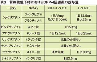 基本は、食事療法・運動療法を行った上で効果不十分が適応となる。以前は他の糖尿病薬との併用は制限があったが、現在GLP-1受容体作動薬以外の全糖尿病薬に拡大された(表2)。但し、スイニーに関しては、インスリン製剤と速攻型インスリン分泌促進薬との併用は、現在臨床試験実施中である(2014.5月現在)。一方、腎排泄型の薬剤は腎機能に応じて減量する必要があり用量にも注意が必要である(表3)。添付文書は改定されることもあるため、使用時には添付文書を一読していただきたい。