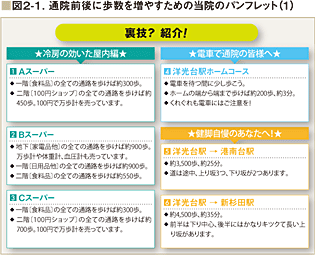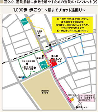 当院では、「1,000歩マップ」などのパンフレット(図2)を用意し、診療の帰りに少し遠回りして1,000歩を体験していただいている。歩数を1,000歩増やすとウエスト・ヒップ比と体重が減少し、1万歩/日に増やすと、体重は平均2kg減少する1)といわれている。