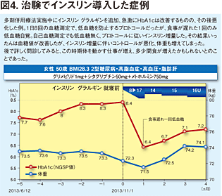 大橋:できるだけHbA1cは正常に近い方がよいのですが、それのみにとらわれ治療強化すると、かえって血糖コントロールが悪化することがあります。例えばインスリン治療開始後、体重もさほど増加せずHbA1cが順調に改善、より一層の改善を求め治療強化すると、突然体重が増加、HbA1cが悪化に転じ、インスリンの増量が必要となることがあります(図4)。