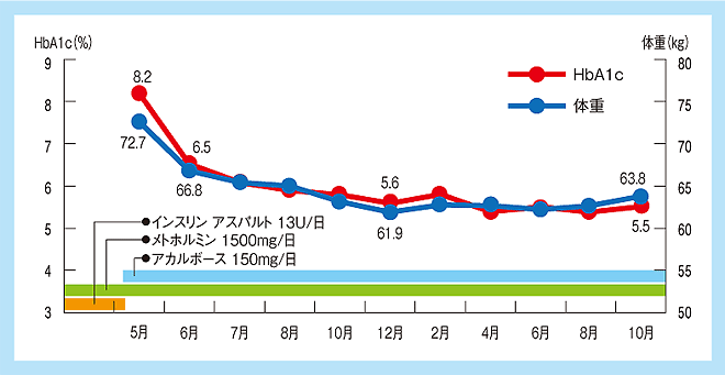インスリン実施が不定であったにもかかわらず、肥満傾向でHbA1cも極度な悪化を認めていなかったことから、インスリン依存性はないものと判断した。したがって、初診時にインスリンは中止し、インスリンレベルを上昇させる薬剤は選択しなかった。いたずらにHbA1c値を下げることを意識せず、当面の生活習慣の是正による血糖改善に期待した。結果的には、診察と指導を通して療養への前向きな姿勢を引き出すことに成功し、ときどきの楽しみを認めながらの療養生活が定着して、血糖コントロールも良好に保たれることとなった。