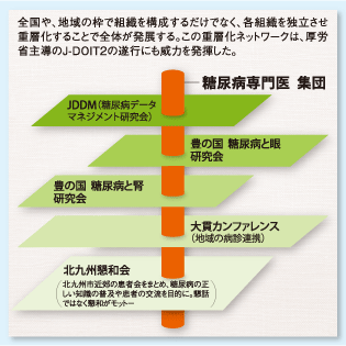 杉本:これは、糖尿病を診る医師の宿命だと思います。糖尿病を診る際に、“血糖屋”になってはいけないのです。血糖値を良くするだけではなく、合併症を防ぎ、人間の総体を診なくてはいけません。それには、単純なネットワークではなく、視点を変えたいろいろなネットワークが必要です。そうでなければ、患者さんをしっかり診ることができない気がします。ネットワークは1つの組織だけでとどまるのではなく、重なりあって活動していかないと、どの会も発展していかないと思います。