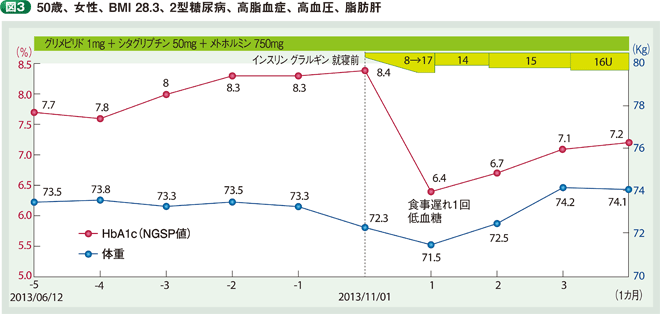 インスリンを増量したにもかかわらず、HbA1cが悪化し体重が増えるというパターンです。インスリンやSU薬など強力な血糖の改善治療中に、ある時点を境に体重増、HbA1cが悪化に転じたら、治療過剰を疑いましょう。過ぎたるは及ばざるがごとしです。これもグラフ化をすると早期に気づきます。
