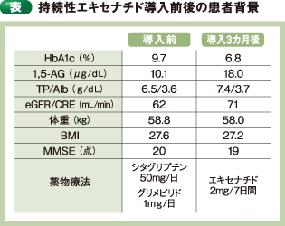 内服薬の増量や、多剤併用による低血糖のリスクを回避し、キードラッグである血糖コントロール薬を確実に投与するため、注射製剤のGLP-1受容体作動薬(持続性エキセナチド)の導入を検討した。持続性エキセナチドは週に1度の投与で、薬剤特性として、単独では低血糖を生じる危険性がほぼない。また、訪問看護師や家族が自己注射を見守ることで、確実な薬剤投与が可能となる。