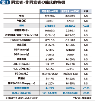 同意者と非同意者において、性別、年齢、罹病期間、治療法、HbA1cなどに差はなかった。同意者は非同意者に比べ、BMIが高く、末梢神経障害が少なく、尿アルブミンが少なかった