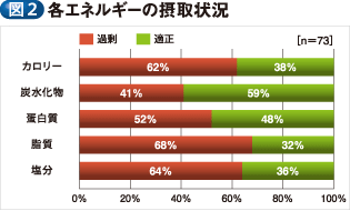 約60%の患者が、総エネルギーを過剰に摂取していた。患者のうち炭水化物では約40%、蛋白質で約50%、脂質約70%、塩分約60%の過剰摂取が認められた
