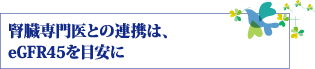 連携にあたっては、患者個々に合わせた、柔軟な対応が必要だ。「もし透析になるとしても、ある程度の時間がないと、患者さんとの人間関係が作れません。腎機能の悪化は、体調や心身の状態に大きな影響を与えます。そのため、薬剤の選択や、食事療法も変わってくる。腎臓専門医に行った途端、あれこれ新しく始めるというより、少し時間をかけて、人間関係ができてからの方が、スムーズに移行できると思います。その辺りの時間も考慮すると、eGFR45くらいで一度腎臓専門医へ診せていただきたいと思います」