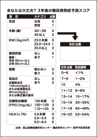 年齢や体格(BMI)、空腹時血糖など8項目に、0~5点の点数を付け、合計が0~6点なら、3年後に糖尿病を発症する確率は1%以下、19~20点と、満点に近い場合は、65%以上と判定される。