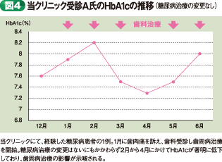 )。当クリニックでは、内科と歯科を併設しており、内科・歯科連携に力を入れている。当内科において、パイロット的に糖尿病患者における口腔内潜血反応を調査したところ、陽性患者が複数人認められた。併設する歯科への受診を勧め、歯周病と診断された症例の経過を追った結果、既報の通り、糖尿病のコントロール状況が改善され、歯科治療が内科治療に対して有用であることが認識された