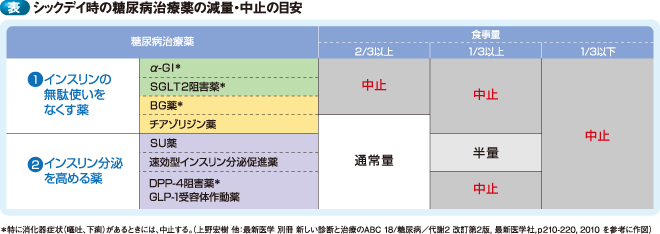 持効型溶解インスリンの量は原則として減量しない。ただし、食事が全く摂れない場合には、低血糖を回避するため医師の指示により中止することもある。